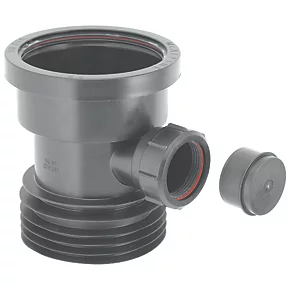 Drain connector with finned seal spigot for internal connection to 4″/110mm cast iron, plastic or clay and 1½” universal vent boss with blanking cap. Should only be fitted on ground floor due to a reduction in the internal outlet diameter of the boss pipe connector.